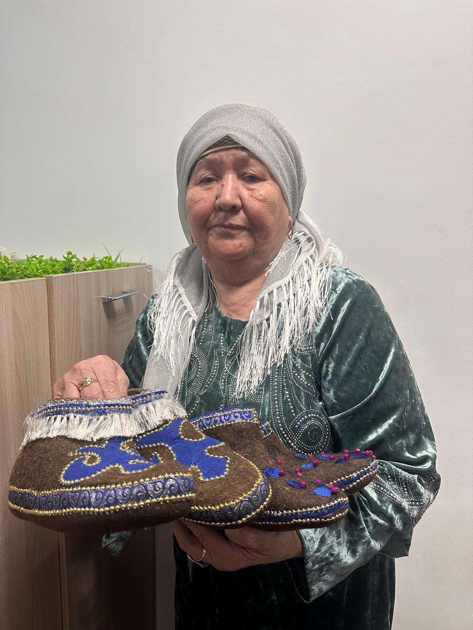 Әңгімелесу барысында көзім бірден қолөнершінің өзімен әкелген аяқ киімдерге түсті. Таза киізден дайындалған аяқ киімдердің бірі ұлттық оюмен өрнектелсе, енді бірі түрлі түсті моншақпен безендірілген екен. Шебердің зор ынтамен, аса ұқыптылықпен дайындағаны көрінді. Бағасы да қолжетімді-ақ. Бір аяқ киімнің бағасы –