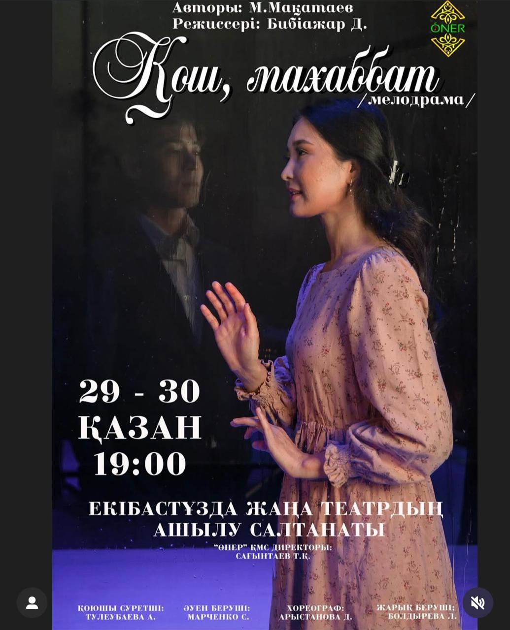 Жаңа театр қазанның 29-30 күндері алғаш рет көрерменін қарсы алып, қазақ поэзиясының көрнекті өкілі Мұқағали Мақатаевтың «Қош, махаббат» мелодрамасын сахналамақ. Өнер ұжымының ақын Мұқағали Мақатаевтың «Қош, махаббат» мелодрамасын таңдауы тегін емес. Себебі «Қош, Махаббат» мәңгілік сезім мен адамдық биік құндылықтарды дәріптейді. Премьераның режиссері – талантты жас режиссер Бибіажар Дихан. Спектакльде еліміздің әр аймағынан келген кәсіби және жас әртістер өнер көрсетеді.